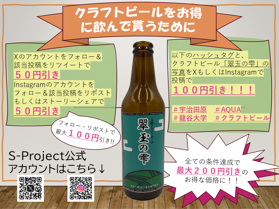 2025.11.20 お知らせ 玉露クラフトビール「翠玉の雫」の割引クーポン情報 XやInstagramにてフォローやリツイートなどして貰うと最大200円の割引クーポンが貰えます。 詳細は当日マルシェ受付で聞いて下さい。 投稿ナビゲーション